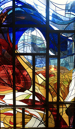 Mais les plombs ne sont pas qu'un support qui permet la dilatation et la réfraction des verres liées aux différences de température. Ils apportent aussi par eux-mêmes les lignes de force qui engendrent tout le vitrail dans sa continuité. Pour cela, trois largeurs de plombs ont été utilisées : 8 mm, 12 mm et même, exceptionnellement, 25 mm ! C'est ainsi que je les ai conçus et dessinés avant toute chose. C'est donc à partir des plombs que le vitrail s'est créé."